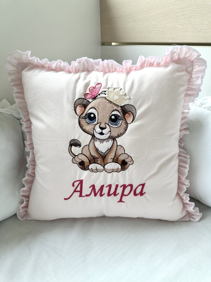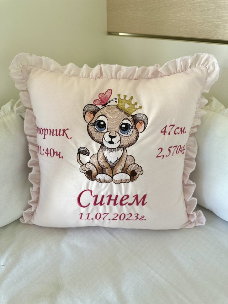 Бродирана персонализирана възглавничка за бебе "Лъвче" - розово