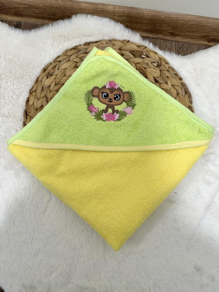 Бебешка хавлия за баня "Маймунка" - жълто/зелено, 80/80см.