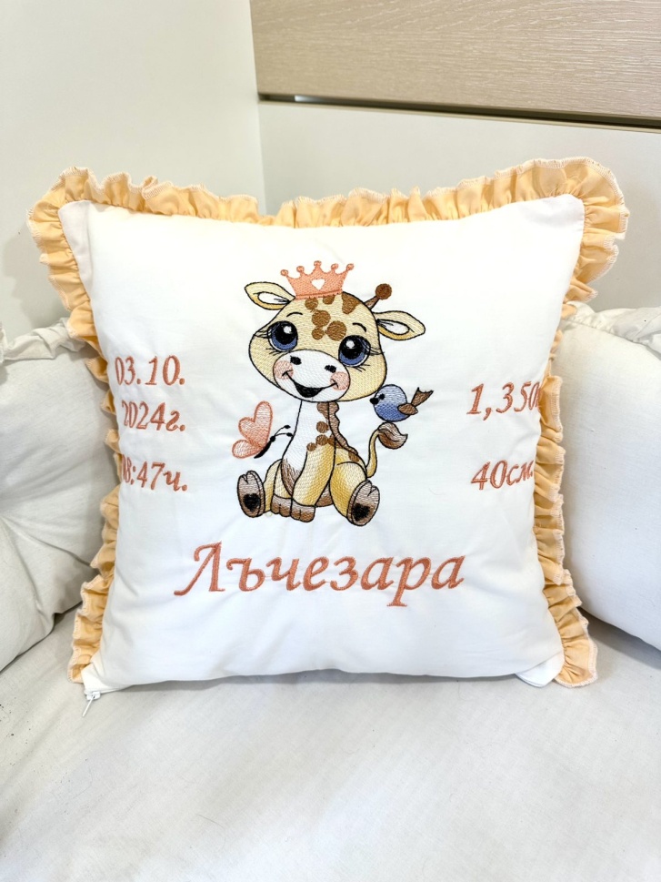 Бродирана персонализирана възглавничка за бебе "Жирафче" - праскова - 40/40см.
