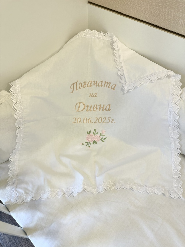 Красиво бродирано платно за завиване на погачата на 40-тия ден.