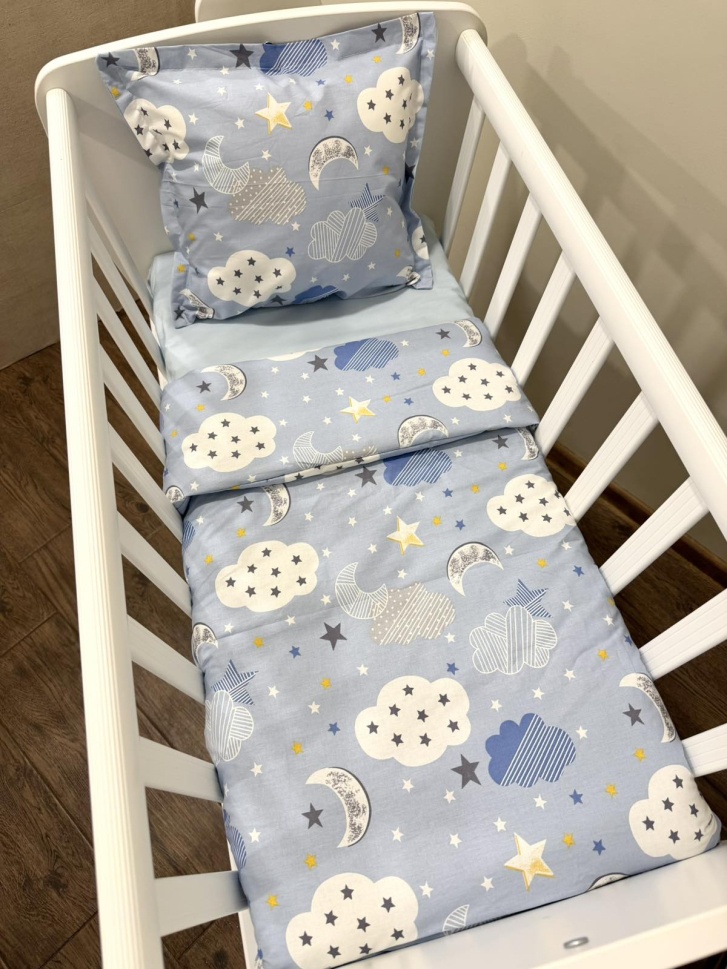 Бебешки спален комплект с олекотена завивка за малка кошара Next to me - "Малки сини облачета"