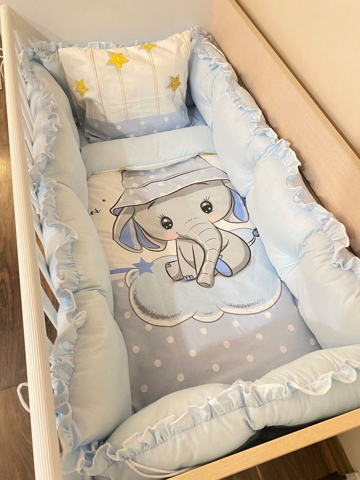 Луксозен бебешки спален комплект 8 части с обиколници "Слонче" - синьо